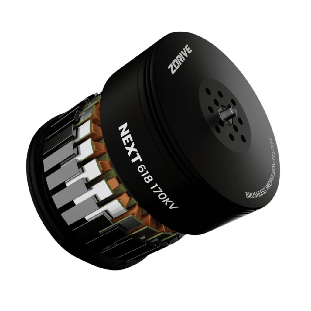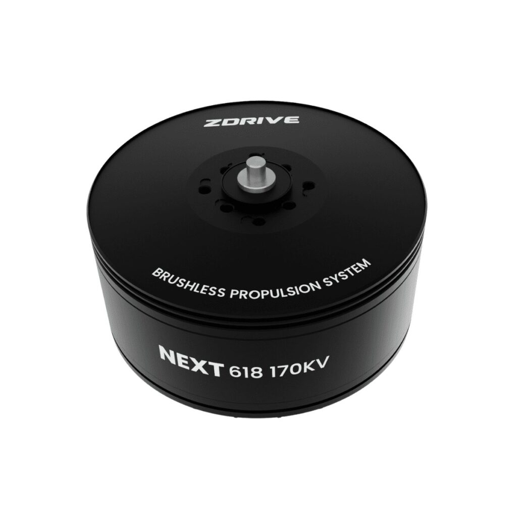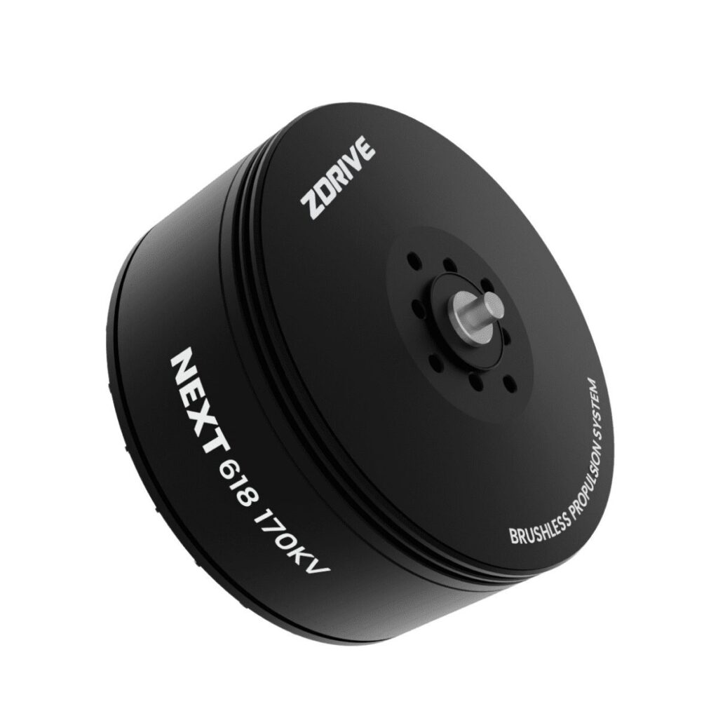 The ZDrive Next N618 (170KV) is a high-performance heavy-lift motor built to power large UAVs requiring precision control and consistent torque output. Weighing 380 g, it features a 72 × 41.4 mm body, optimized for 6S–12S (up to 14S) LiPo systems, and delivers exceptional thrust efficiency.